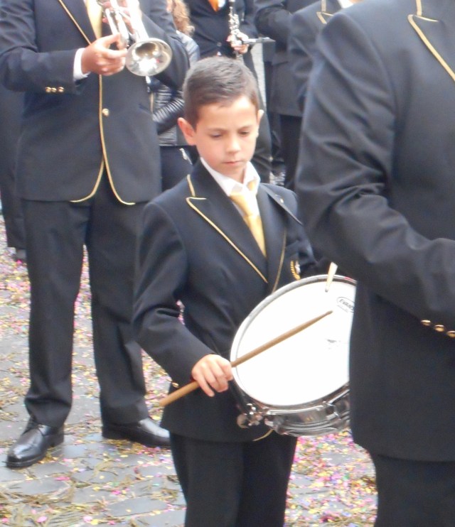It took more than fifteen minutes for this multitude to walk past, and I forgot about the existence of the flower carpets until after the last row of the faithful went by — and then, as the final part of the procession continued with more filarmónica brass bands and dignitaries, I could see that the flower carpets had been completely dispersed, crushed and pulverized into a chaotic impressionist painting of colour, worthy of a Monet. I understood this wondrous transformation, trampled by faith, as a deep symbol of their lives as they created a new kind of flower carpet with their feet, one that shows humanity in its brokenness and confusion — and yet, and yet… There was such beauty and movement in this disorder of scattered, shredded petals and leaves mixed together with the sawdust, redesigned by a living faith.