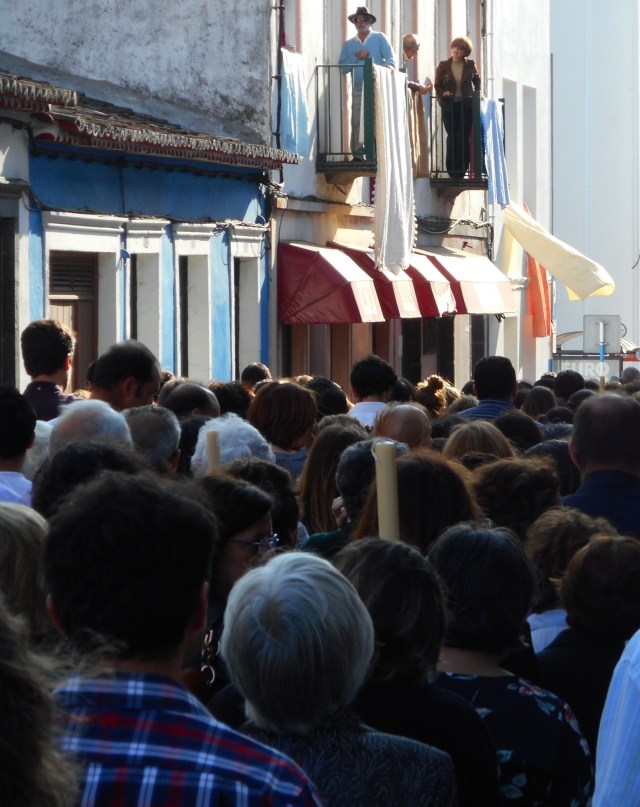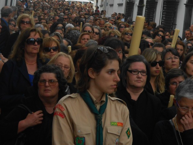 Once the statue has passed by, in case you thought the climax of the procession was over, you are amazed to see a sudden outpouring of thousands of people who fill the street from side to side with no room for anyone to squeeze by. They follow behind the Christ to fulfill a “promessa,” and all that deliberate order and avoidance of disturbing the flower carpets is forgotten. It’s even unseen, hidden by this predominantly female ocean, although in recent times a few men walk with them either as a sign of solidarity or because the division of the sexes is not as strict as in the old days when only women would comprise this part of the procession.