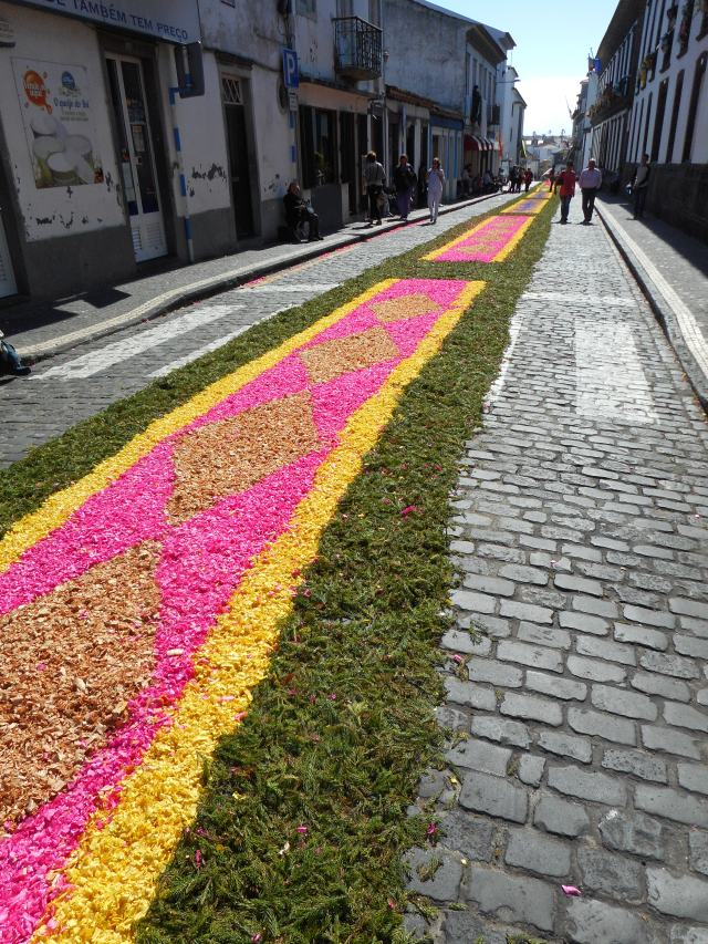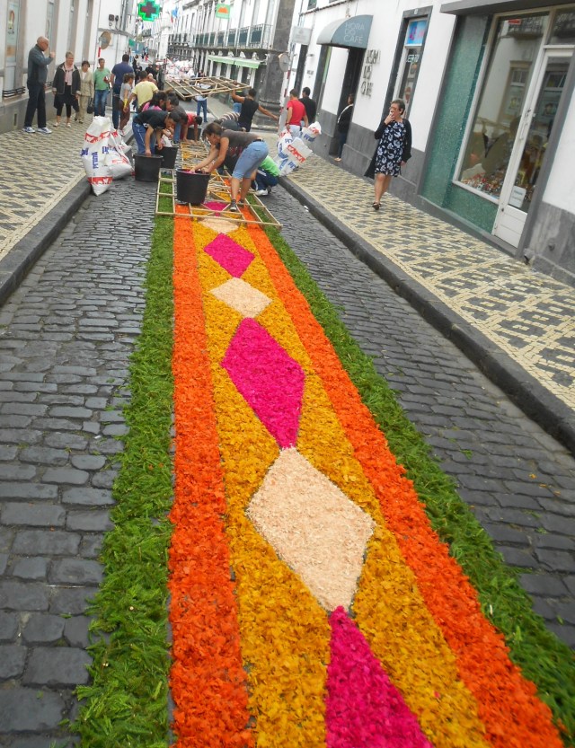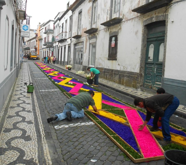 Very early in the morning of the fifth Sunday after every Easter, people come together to create the long, beautiful flower carpets that are spread throughout the city streets of Ponta Delgada in anticipation of the afternoon procession of O Senhor Santo Cristo dos Milagres, the Lord Holy Christ of the Miracles.
