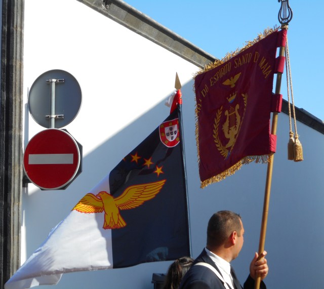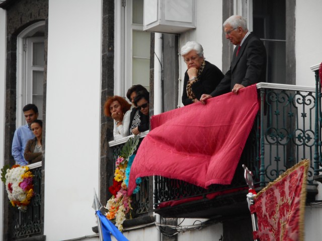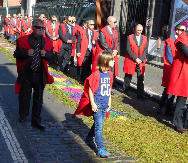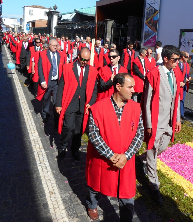 Wherever you wait to see the solemn procession pass, you know it’s coming when, still in the distance, you spot the guião, the large red banner carried by the head of the procession; and then you enter a sacred time and you will stay still until it’s over. Behind the banner follow so many hundreds of men of all ages and backgrounds that they have to be organized in doubles for each row; otherwise, the procession would take even longer. They all wear a red “opa”, and many carry a rosary, but none of them will dare step on the flower carpets.