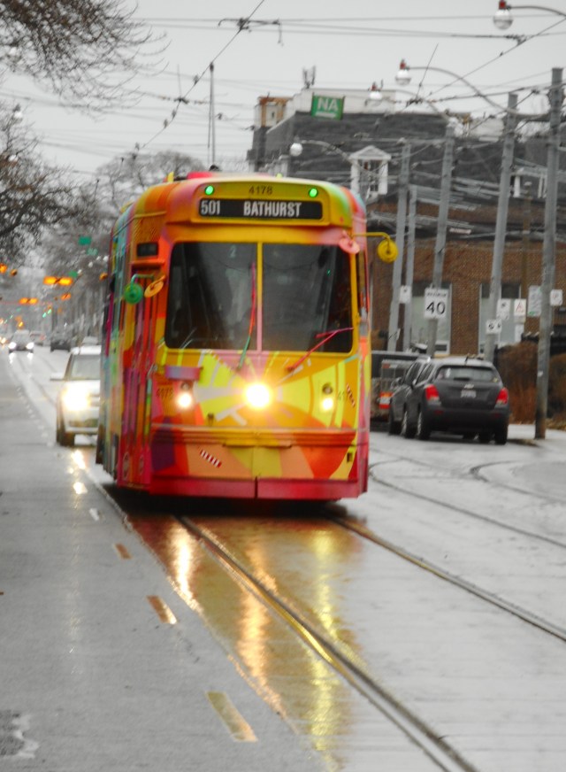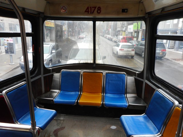 Stephen, my partner, and I went on a ride from Greenwood to Bathurst and back. It was an experience we will fondly remember, not only because it gave us a chance to ride once more but because, as we sat at the very back of the streetcar, shaped like a cozy living room, we met and talked to beautiful young people who care about our city and this mode of public transportation, forgoing the convenience of the car for the sake of the communal experience of a streetcar ride.