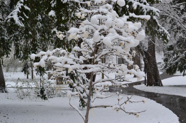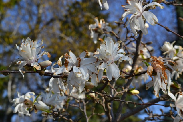 Every year, I like to go see it unfold in early spring. Last week it was doing well and I photographed the beauty of its new flowers. A few days later, we had a heavy snowfall which smothered the delicate white blooms. The day after, the snow melted, and I went back to see if it survived unscathed. Unfortunately, it did not. Yet, there remains a gentle beauty to these weather-beaten flowers that painfully reminds me of the fragility of life. They are still clinging to the branches, not willing to let go just yet, wanting to stay for as long as they can, even if bruised.