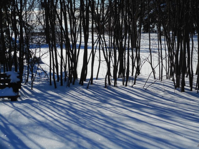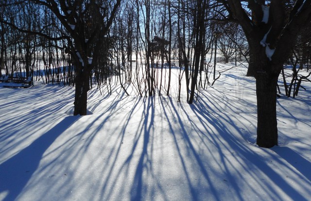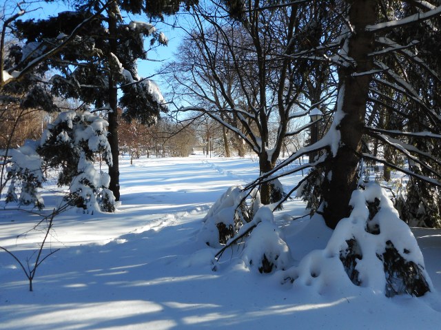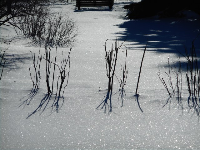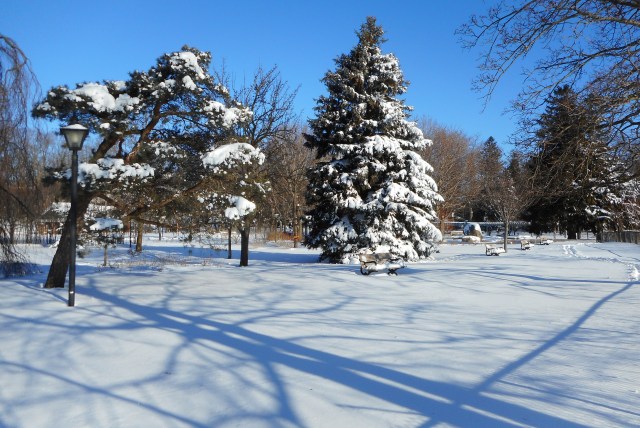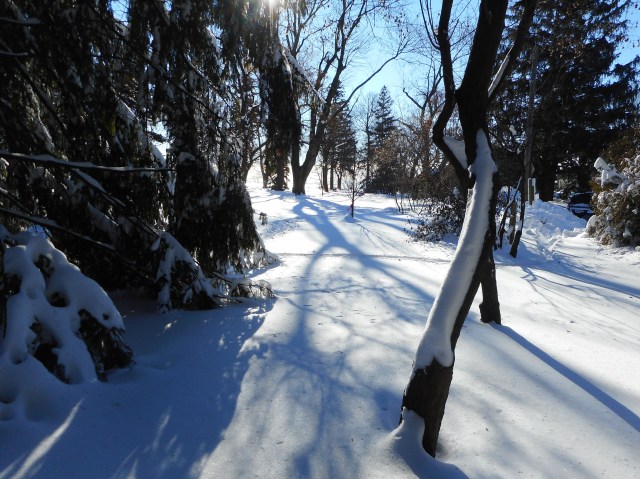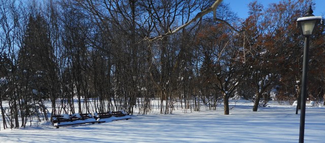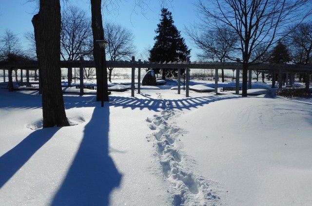 The next day the streets were still covered in snow but it was a sunny morning and despite the minus 21 temperature I ventured out with my heaviest winter coat and Sorel boots on a solitary walk to Rosetta McClain Gardens. To my delight, I was the only one there so it was a treat to have the place to myself. The snow was knee-deep and although some tracks were already made by hardier souls who ventured out even earlier that I did, it was a good workout as I made my way through the garden.